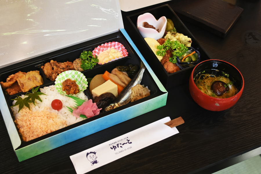 提供された「川床弁当」は、 特産品のシイタケを使った南蛮や郷土料理の煮しめ、煮しめを使った コロッケなど、西米良の幸をつめこんだ特製弁当。 |